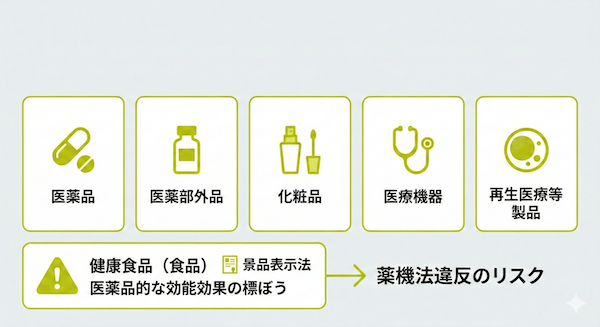- 健康食品:「飲むだけで痩せる」「〇〇病の予防に」などは医薬品的な効能効果の標ぼうとみなされるリスクが高いです。