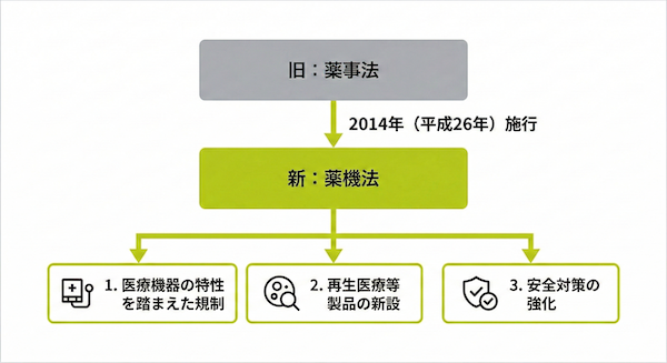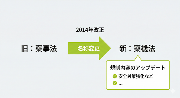 平成25年(2013年)11月27日に「薬事法等の一部を改正する法律」が公布され、翌年の平成26年(2014年)11月25日に施行されました。この改正によって、法律の題名が変更されるとともに、新たな規制枠組みが構築されました。