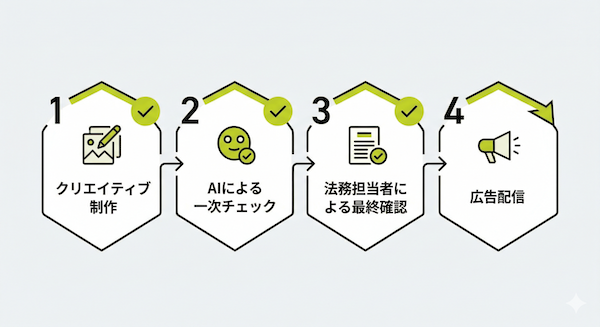 法務担当者とクリエイティブ担当者の間で、よく使うOK表現・NG表現のリストを作成し共有することが有効です。属人化を防ぎ、社内や広告代理店との認識のズレをなくすことで、修正のラリーを減らすことができます。
